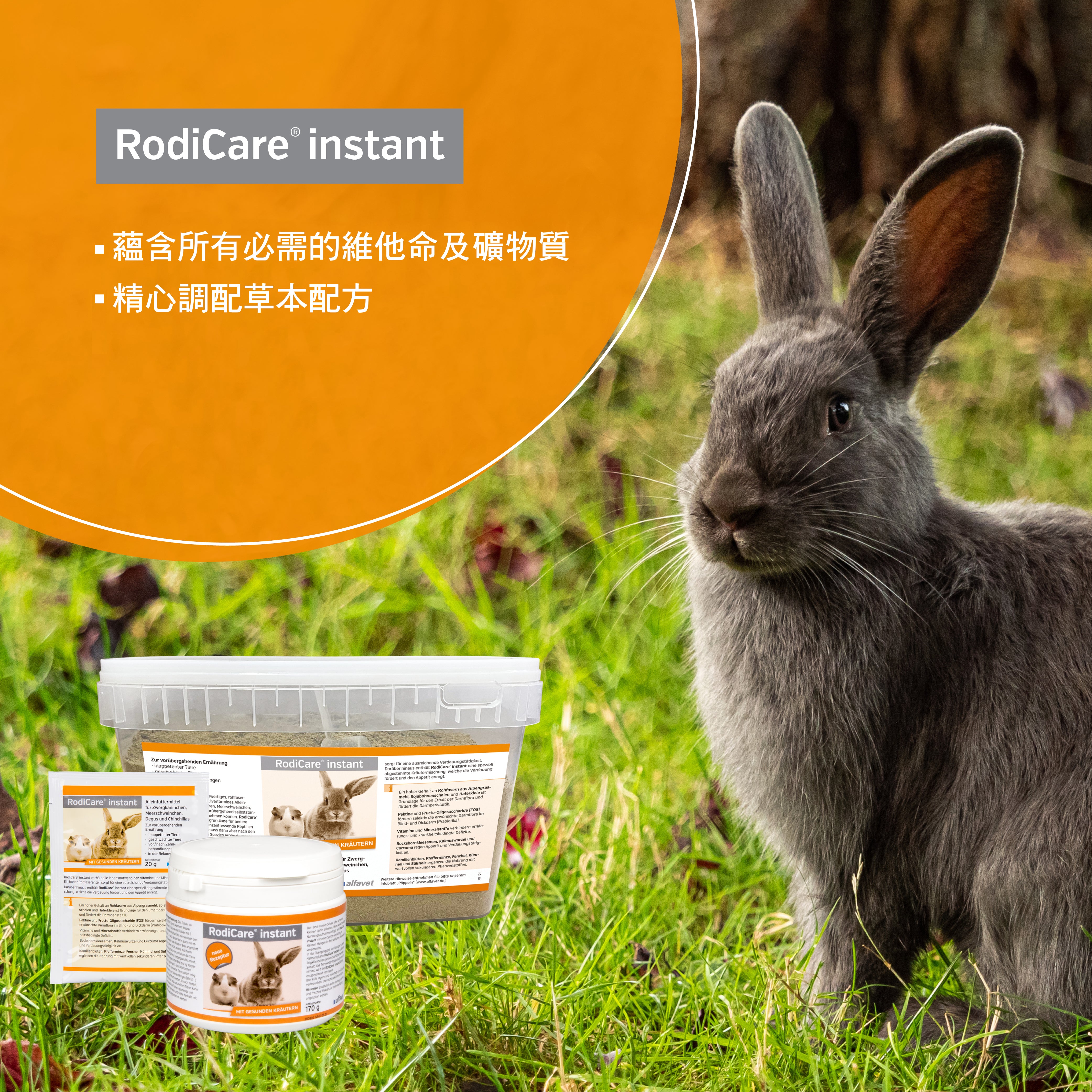 RodiCare® Instant is a high-quality, high-fiber, low-calcium powdered complete feed designed for small pets that are temporarily unable to eat solid food on their own. This product is also suitable as a commercial feed for young animals, or as a supplementary feed for weak or stunted young animals that are no longer fully dependent on their mother's milk. This product contains all essential vitamins and minerals, and is rich in Vitamin C, ensuring that animals maintain adequate intake even when fresh food is temporarily unavailable. The high fiber content promotes digestion, and the carefully formulated herbal blend supports digestive function and stimulates appetite.