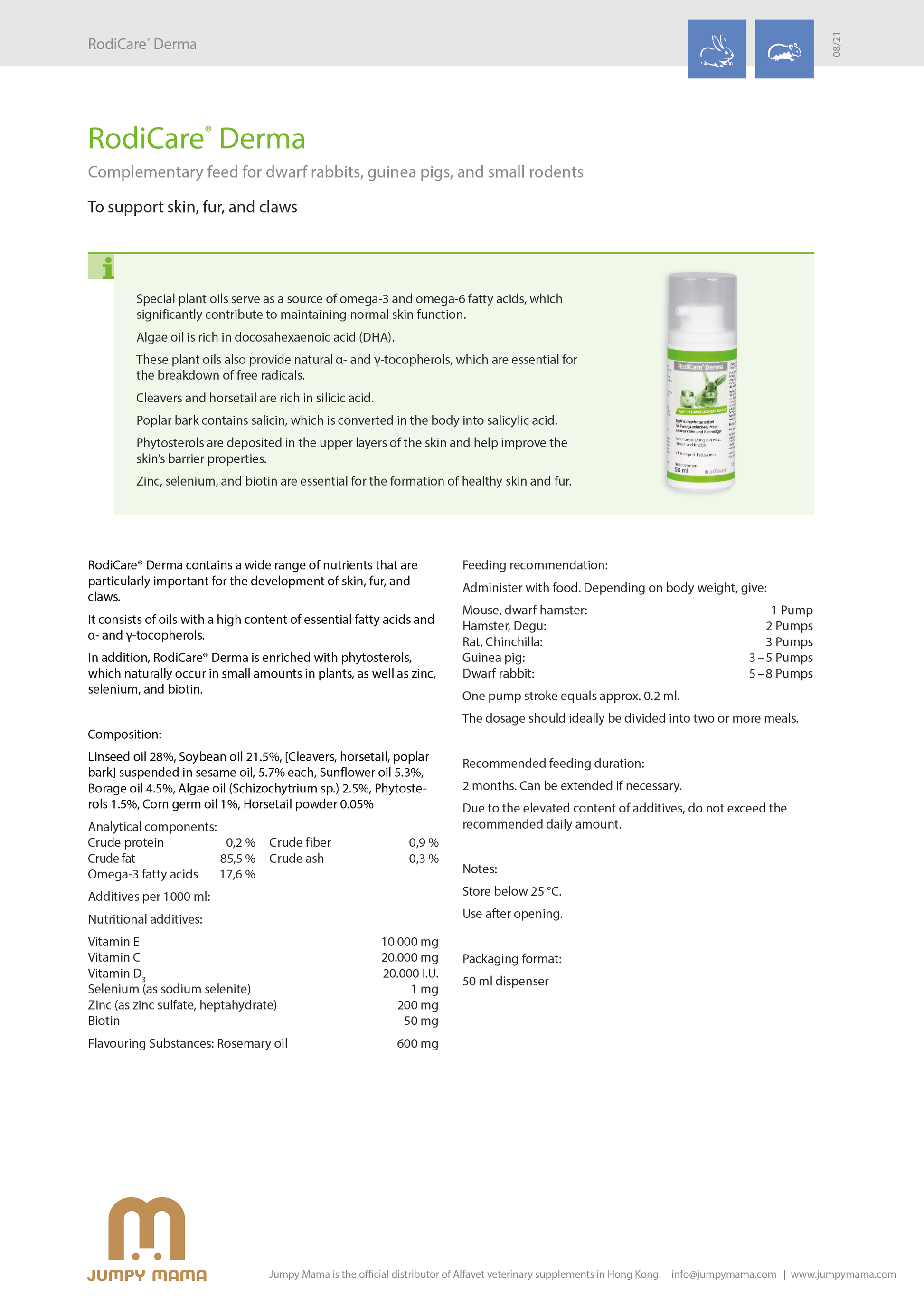 RodiCare® Derma contains a wide range of nutrients that are particularly important for the development of skin, fur, and claws.