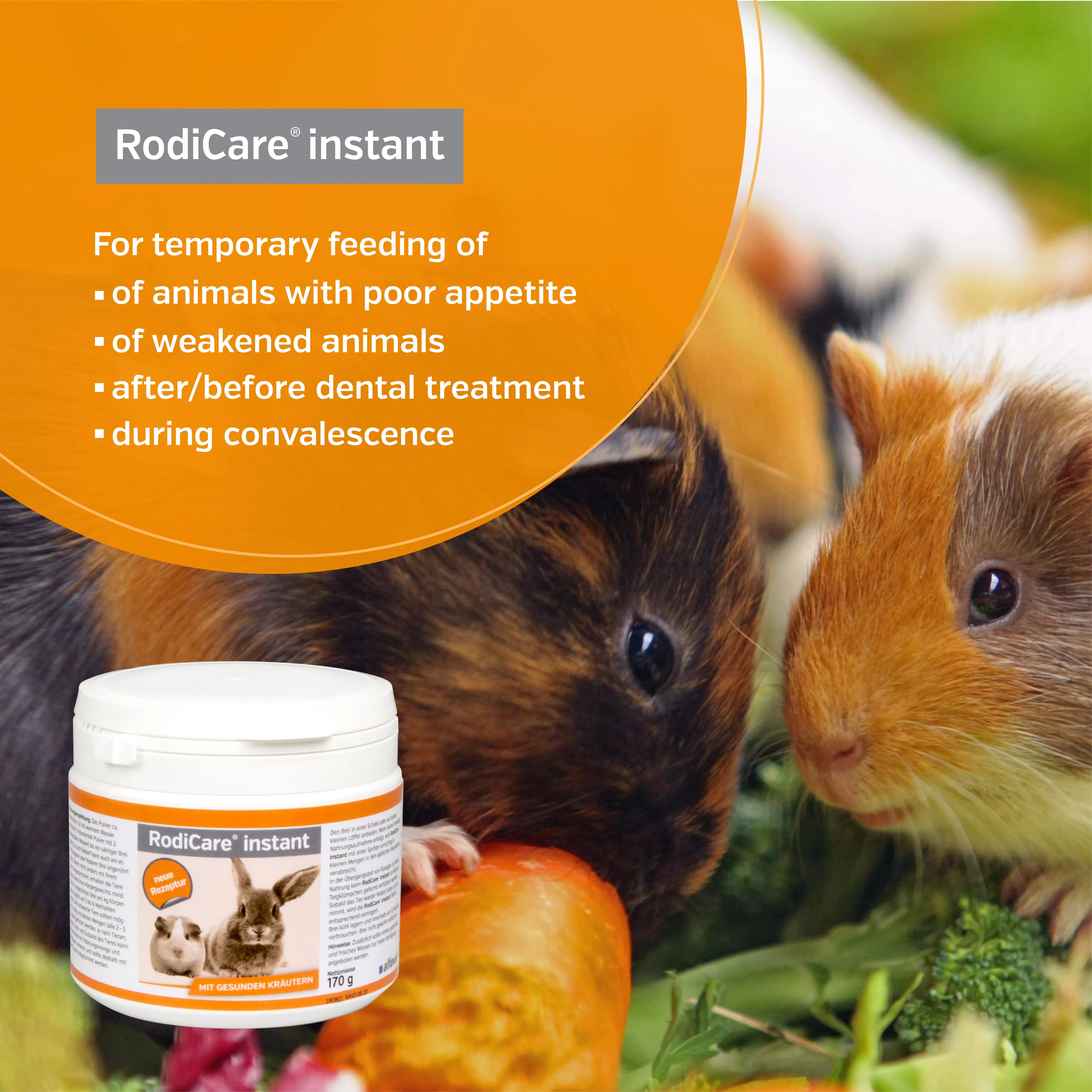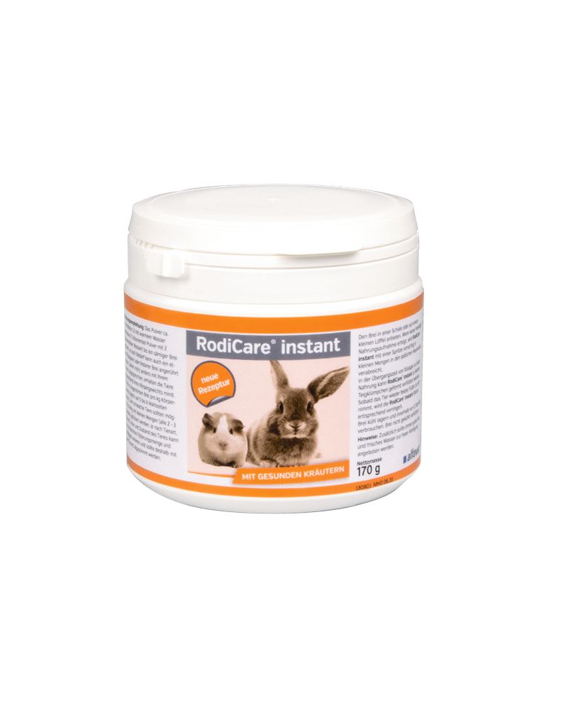 RodiCare® instant is a high-quality complete food in powder form rich in crude fibre and low in calcium for dwarf rabbits, guinea pigs, chinchillas and degus that are temporarily unable to eat solid food on their own.