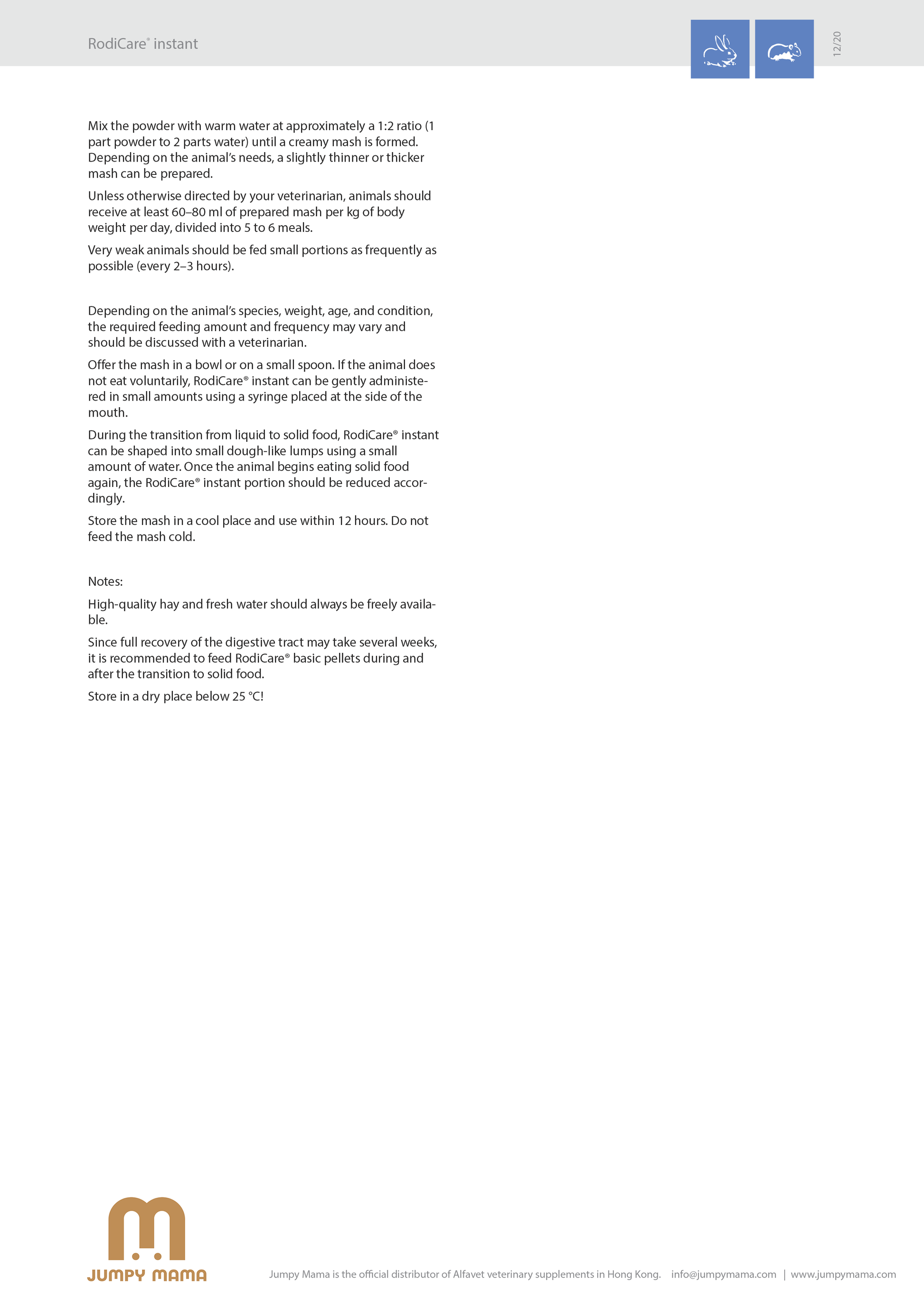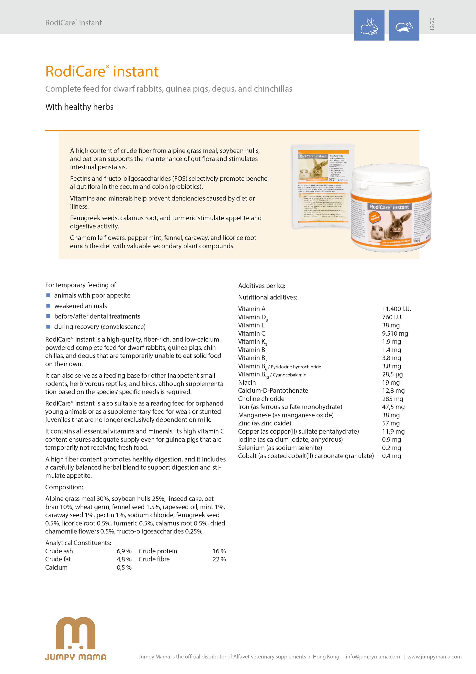 RodiCare® instant is a high-quality, fiber-rich, and low-calcium powdered complete feed for dwarf rabbits, guinea pigs, chin-chillas, and degus that are temporarily unable to eat solid food on their own.